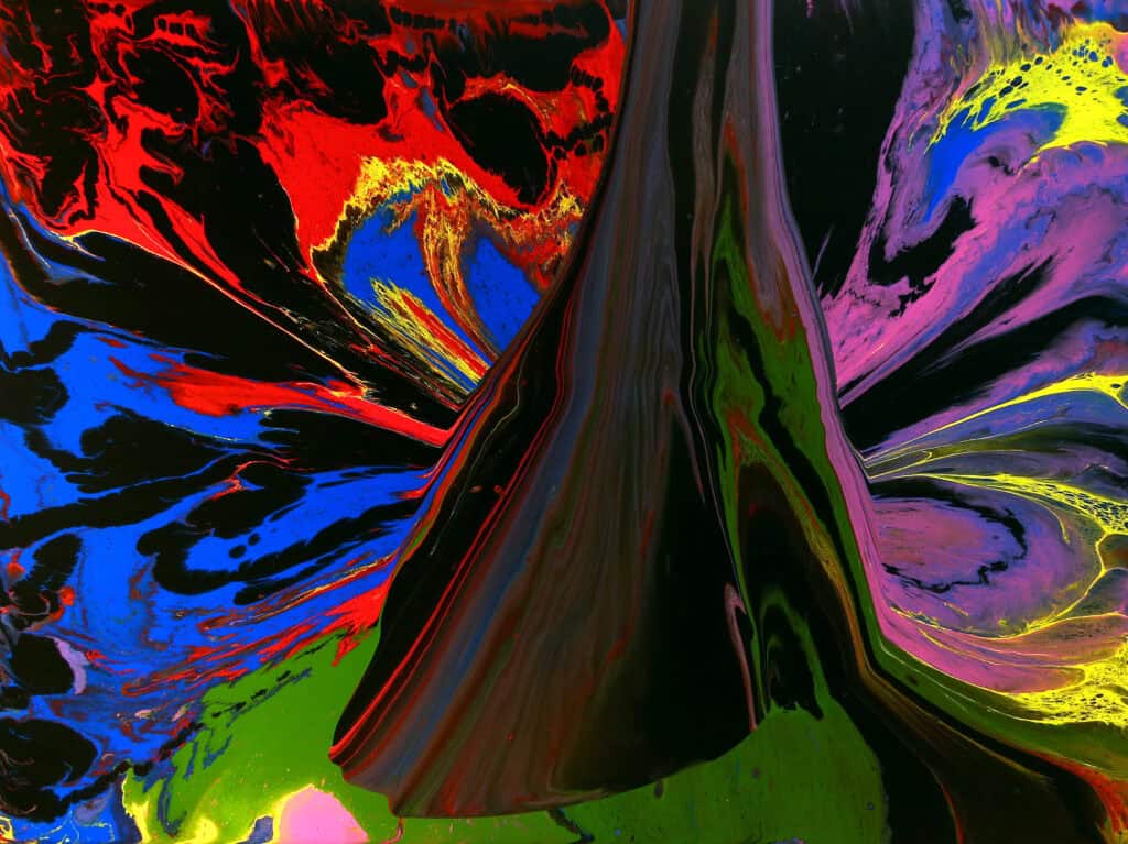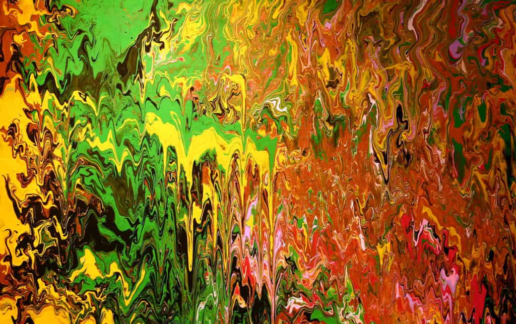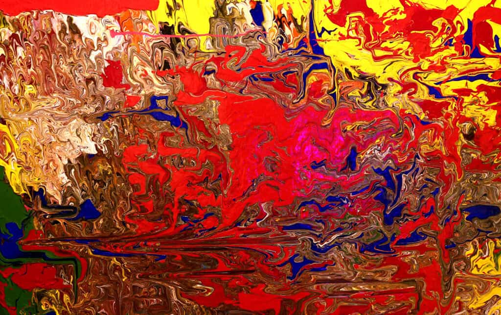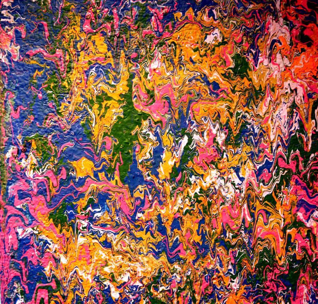 Alles waarmee hij kon schilderen kwam eraan te pas; spatels, borstels, pipetjes, slangetjes, rietjes etc. En met z’n tokkelende vingers speelde hij in z’n verbeelding een pianosonate in rood, groen en blauw