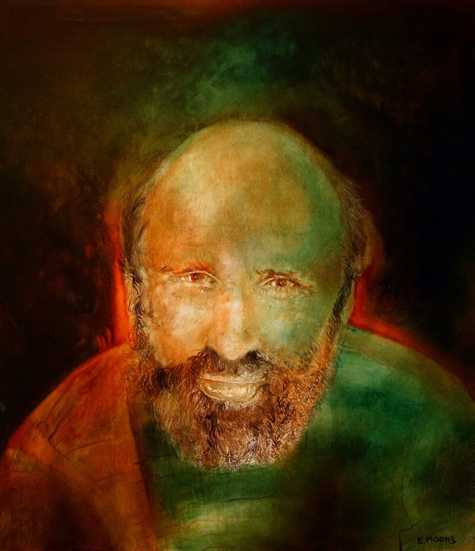 Er zijn nogal wat zelfportretten van Edward Moons. Hij schilderde zichzelf in vooraanzicht en profiel, met diverse gezichtsuitdrukkingen, gewoon, vrolijk of ernstig. Het mag duidelijk zijn dat hij dat niet deed uit ijdelheid. Het onderwerp leende zich goed om het schilderen zelf te onderzoeken. De krulletjes van zijn baard, zijn schaarser wordende haar, de uitdrukking van de ogen.
