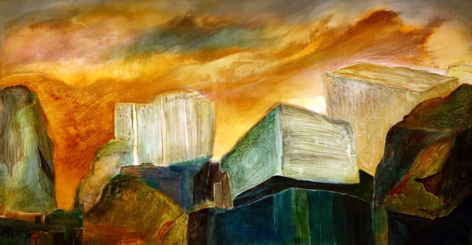 Zo kwam Warre Moons in beeld. Warre had vanuit zijn atelier zicht op onze voorraad blokken natuursteen. De stapeling van dit zware materiaal, nog in ruwe blokvorm zoals die werden ontgonnen in de steengroeve inspireerde Warre. Hij schilderde diverse werken over dit onderwerp. Het werden geen stillevens van blokken, geen landschapstafereeltjes, maar een heel eigen interpretatie en visie erop. En dat beantwoordt perfect aan het doel ervan, de toeschouwer (en vooral mij) doen nadenken, op een verkeerd (ander) been zetten.